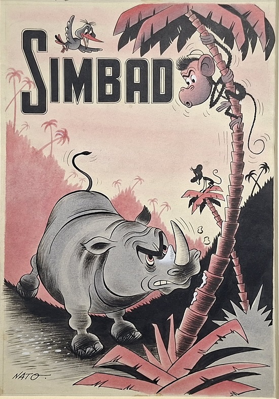 Obra visual de formato rectangular y disposición vertical. Dibujo policromado. En el centro de la composición una figura zoomorfa golpeando el tronco de un árbol. En la parte superior, la palabra "SIMBAD".