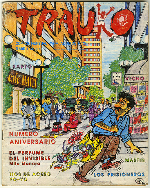 Secuencia de historietas publicadas en forma de folleto serializado. Objeto de forma rectangular en presentación vertical. Sus tapas son de papel couche impreso en color. Cuenta con dos membretes en su lomo. Sus hojas son de papel pulpa impreso en tinta negra, y papel couche impreso en tinta de color. En anverso, se observa Titulo "TRAUKO" en parte superior con un trazo que da la impresión de una manuescritura realizada con un plumon rojo, donde la letra K se asimila a una figura humana. Bajo el título se aprecian textos en colores. Cubriendo el plano del anverso, se observa ilustración de Martín Ramírez. Checho López (hombre de mediana estatura con bigote y barba descuidada. Caisa azul desabotonada y pantalón café) arrancando por una calle centrica de Santiago a la manera de un comerciante informal con un paño_bolso lleno de productos (relojes). En su interior se aprecian diferentes historietas: Kiki Bananas ("Karto" Claudio Romero), Tios de Acero ("Yo-Yo" Mauricio Salfate. Guión: Leo Prieto), El Monstruo de Penca del Mar ("Vicho" Vicente Plaza. Guión: Mario Rojas),Checho López (Martín Ramírez), entre otras. Además incluye textos en su "Traukotorial", Kriticón (Jorge Cavada), Korreo, Todo Pasando, anuncios publicitarios y una cartelera cultural. Sus páginas se encuentran numeradas en la parte central inferior.Total 66 páginas.