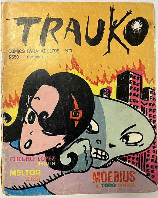 Secuencia de historietas publicadas en forma de folleto serializado. Objeto de forma rectangular en presentación vertical. Sus tapas son de papel couche impreso en color. Cuenta con dos membretes en su lomo. Sus hojas son de papel pulpa impreso en tinta negra, y papel couche impreso en tinta de color. En anverso, de fondo amarillo, se observa Titulo "TRAUKO" en parte superior con un trazo que da la impresión de una manuescritura realizada con un plumon negro , y donde la letra K se asimila a una figura humana. Bajo el título se aprecia un texto en color negro. Cubriendo el resto del plano se observa ilustración de "Meltor" (Miguel Hiza) estrangulando a una figura femenina (Marcek). En el fondo edificios incendiándose. En su interior se aprecian diferentes historietas: Alack Sinner(Muñoz-Sampayo), Checho López (Martín Ramírez), Meltor ( miguel Hiza), entre otras. Además incluye textos en su editorial, correo con lectores, artículos, anuncios publicitarios y más. Sus páginas se encuentran numeradas en la parte central inferior.Total 60 páginas.