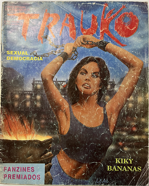 Secuencia de historietas publicadas en forma de folleto serializado. Objeto de forma rectangular en presentación vertical. Sus tapas son de papel couche impreso en color. Cuenta con dos membretes en su lomo. Sus hojas son de papel pulpa impreso en tinta negra, y papel couche impreso en tinta de color. En anverso, se observa Titulo "TRAUKO" en parte superior con un trazo que da la impresión de una manuescritura realizada con un plumon rojo , y donde la letra K se asimila a una figura humana. Bajo el título se aprecian textos en colores. Cubriendo el plano del anverso se observa ilustración de "Leal" (Andrés Leal). Mujer encadenada con grilletes en sus muñecas al lado de un tarro prendido fuego. De fondo se observa el palacio de La Moneda con una bandera chilena ondeando. En su interior se aprecian diferentes historietas: Kiky Bananas ("Karto" Claudio Romero), el Trauko ("Yo-Yo" Mauricio Salfate), Blondi (Lautaro Parra), La intranquilidad ("Qlamton" Caludio Galleguillos), Norte Claro Sur Oscuro (Juán Vásquez.Guión: Gregory Cohen), La Mercancía ("Felva" Felipe Silva), Coma Comix (Andrés Leal), entre otras. Además incluye textos en su "Traukotorial", Korreo, Todo Pasando, La Era de los Cyberpunks (Mario Rojas), De Navajas...(Fabio Salas), Concurso Fanzine, anuncios publicitarios y una cartelera cultural. Sus páginas se encuentran numeradas en la parte central inferior.Total 66 páginas.