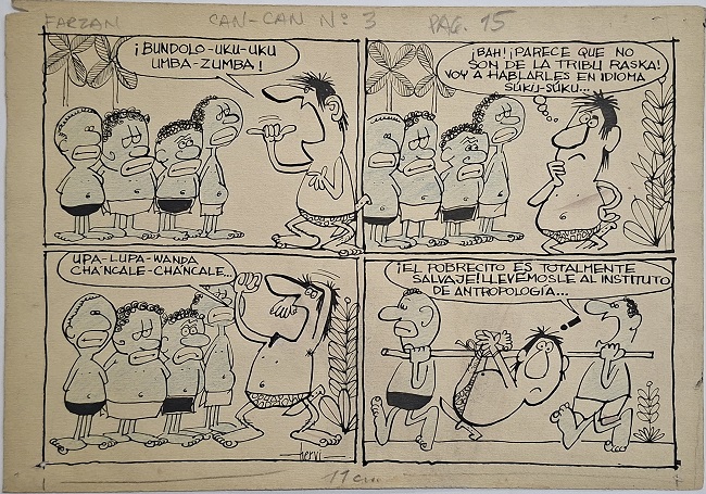 Obra visual de formato rectangular y disposición horizontal. Dibujo monocromo. Está compuesto por cuatro viñetas protagonizadas por varias figuras masculinas.