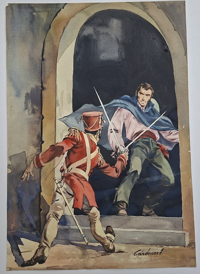 Obra visual de formato rectangular y disposición vertical. Dibujo policromado. En el centro de la composición dos figuras masculinas frente a frente mientras sostienen espadas.