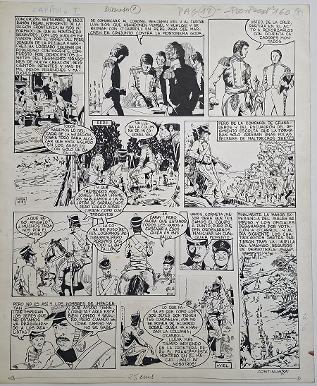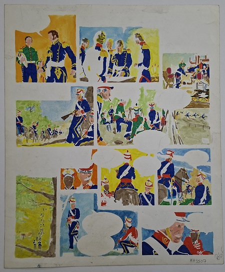 Obra visual de formato rectangular y disposición vertical. Dibujo monocromo. Está compuesto por once viñetas protagonizadas por varias figuras masculinas vestidos con trajes militares. En el reverso, las mismas escenas, pero coloreadas.