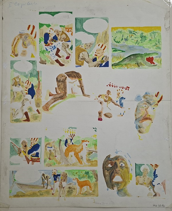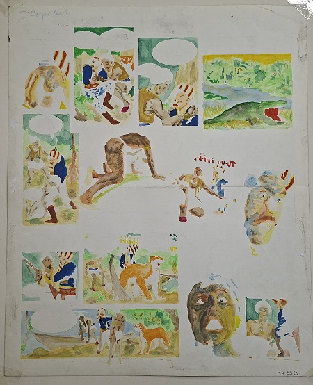 Obra visual de formato rectangular y disposición vertical. Dibujo monocromo. Está compuesto por doce viñetas protagonizadas por varias figuras masculinas. En el reverso, las mismas escenas están coloreadas.