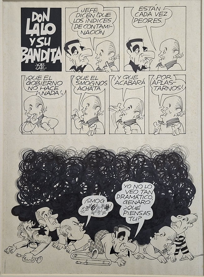 Obra visual en formato rectangular y disposición vertical. Dibujo monocromo. Está compuesto por ocho viñetas protagonizadas por varias figuras masculinas.