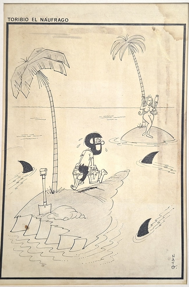 Este dibujo se publicó como parte de la historieta titulada “Toribio el náufrago”. Aunque este personaje cómico, que vivía en una isla desierta, fue creado en 1945 por René Ríos Boettiger (Pepo) para la revista Pobre Diablo, alcanzó gran popularidad gracias al trabajo de Renato Andrade (Nato), quien desde 1947 lo ilustró para diversas revistas chilenas de la época.