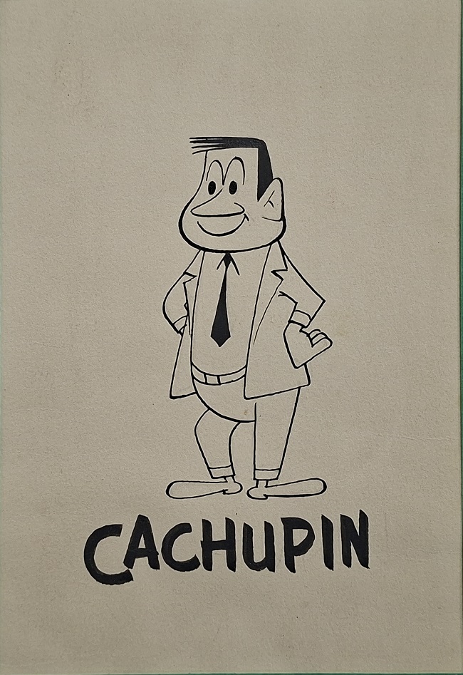Obra visual en formato rectangular y disposición vertical. Dibujo monocromo. Se presenta una figura masculina, con traje y manos en la cintura. En la parte inferior tiene la palabra “Cachupin”.
