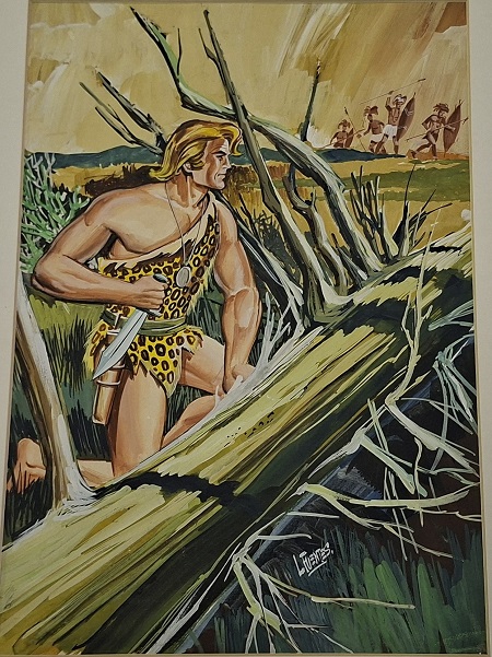 Obra visual de formato rectangular y disposición vertical. Dibujo policromado. En el primer plano de la composición una figura masculina de medio cuerpo portando un arma blanca, y escondido cerca de un tronco de árbol. De fondo, varias figuras masculinas armadas.