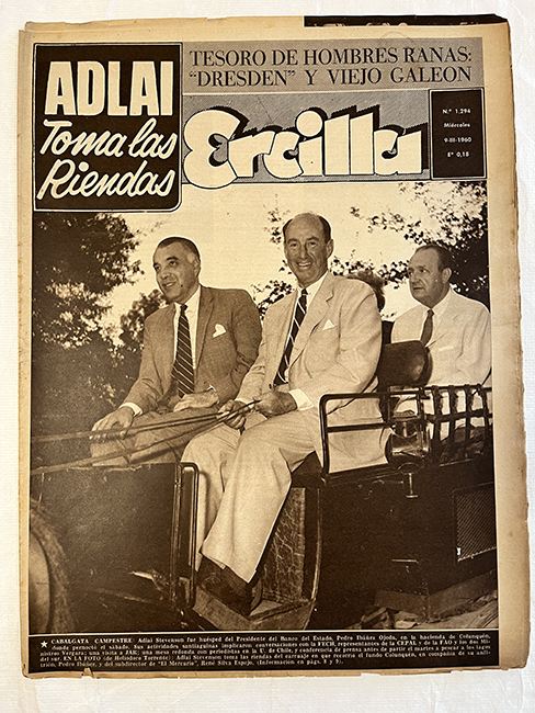 Publicación periódica. Papel impreso en disposición horizontal. En tapa texto impreso en tinta negra y blanca en parte superior, al centro fotografía impresa en blanco y negro (diplomático estadounidense Adlai Stevenson subido en carruaje con las riendas en sus manos). Bajo ella texto en tinta blanca con fondo en tinta negra. En su interior textos impresos en tinta blanca y negra con diferentes informaciones (noticias, reportajes, crónicas, anuncios publicitarios, etc.). Incluye múltiples fotografias, ilustraciones y tiras cómicas impresa en blanco y negro.