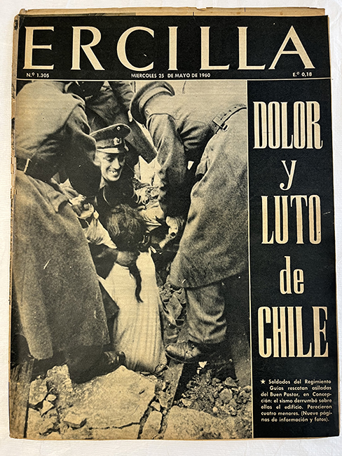 Publicación periódica. Papel impreso en disposición horizontal. En tapa texto impreso en tinta negra y blanca en parte superior, cubre el plano fotografía impresa en blanco y negro (Soldados en rescate de personas producto de terremoto de 1960). sobre ella texto en tinta negra. En su interior textos impresos en tinta blanca y negra con diferentes informaciones (noticias, reportajes, crónicas, anuncios publicitarios, etc.). Incluye múltiples fotografias, ilustraciones y tiras cómicas impresa en blanco y negro.
