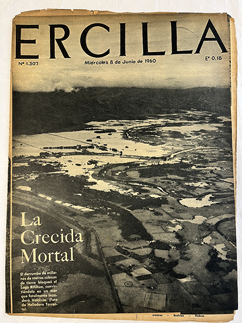 Publicación periódica. Papel impreso en disposición horizontal. En tapa texto impreso en tinta negra y blanca en parte superior, cubre el plano fotografía impresa en blanco y negro (imagen aerea del desbordamiento del lago Riñihue producto del desplazamiento de tierra producido por terremoto). sobre ella texto en tinta negra. En su interior textos impresos en tinta blanca y negra con diferentes informaciones (noticias, reportajes, crónicas, anuncios publicitarios, etc.). Incluye múltiples fotografias, ilustraciones y tiras cómicas impresa en blanco y negro.