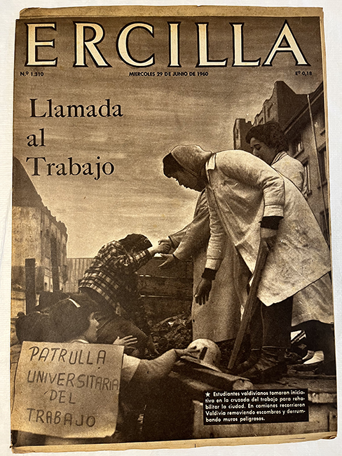 Publicación periódica. Papel impreso en disposición horizontal. En tapa texto impreso en tinta negra y blanca en parte superior, cubre el plano fotografía impresa en blanco y negro (estudiantes valdivianos trabajando en la rehabilitación de la ciudad trás el terremoto y maremoto). sobre ella texto en tinta negra. En su interior textos impresos en tinta blanca y negra con diferentes informaciones (noticias, reportajes, crónicas, anuncios publicitarios, etc.). Incluye múltiples fotografias, ilustraciones y tiras cómicas impresa en blanco y negro.