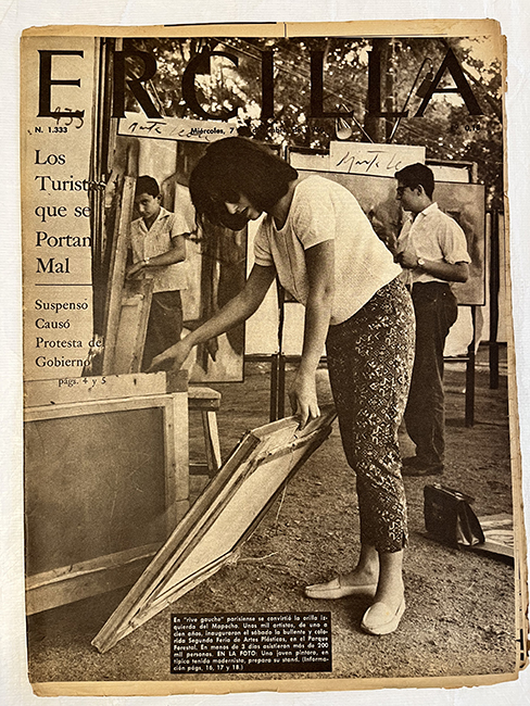 Publicación periódica. Papel impreso en disposición horizontal. En tapa texto impreso en tinta negra y blanca en parte superior, cubre el plano fotografía impresa en blanco y negro (joven pintora prepara sus obras en stand para feria) ella texto en tinta negra. En su interior, textos impresos en tinta blanca y negra con diferentes informaciones (noticias, reportajes, crónicas, anuncios publicitarios, etc.). Incluye múltiples fotografias, ilustraciones y tiras cómicas impresa en blanco y negro.