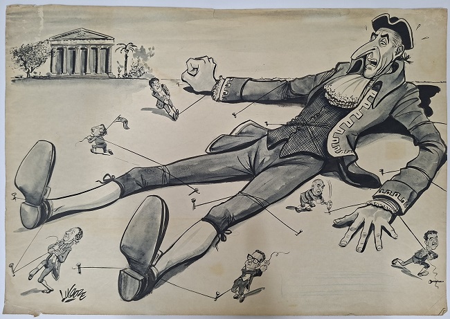 Obra visual de formato rectangular y disposición horizontal. Dibujo monocromo. En el primer plano de la composición una figura masculina con rasgos exacerbados sobre una superficie. En los brazos y piernas se observan otras figuras masculinas de menor tamaño sosteniendo cuerdas. De fondo, una construcción con seis columnas verticales.