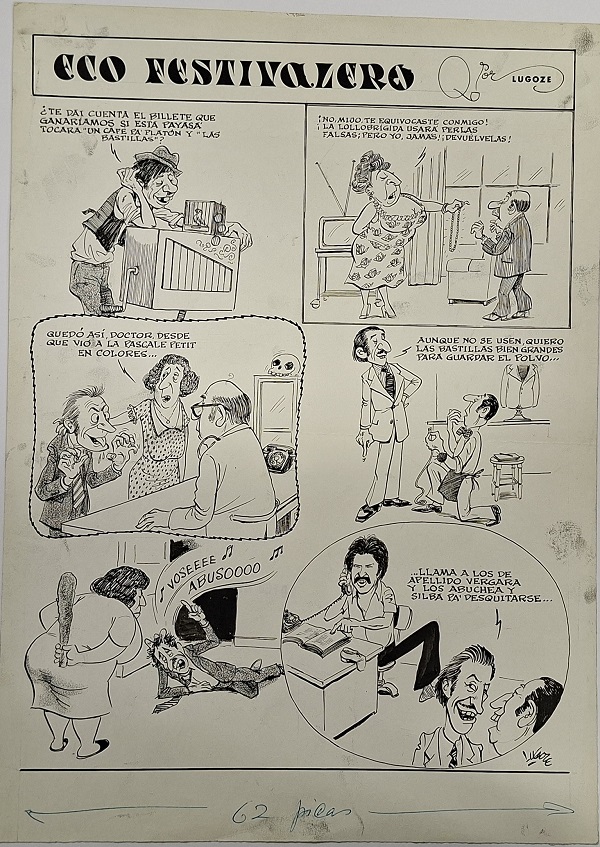 Obra visual de formato rectangular y disposición vertical. Dibujo monocromo. Está compuesto por seis viñetas protagonizadas por varias figuras femeninas y masculinas. En la parte superior, a modo de título, dice: "eco festivalero".