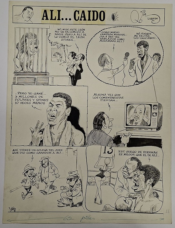 Obra visual de formato rectangular y disposición vertical Dibujo monocromo. Está compuesto por seis viñetas protagonizadas por varias figuras masculinas y femeninas. En la parte superior, a modo de título, dice: "Ali...caido".