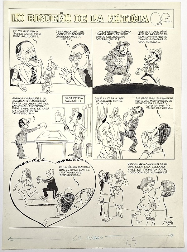 Obra visual de formato rectangular y disposición vertical. Dibujo monocromo. Está compuesta por seis viñetas protagonizadas por varias figuras femeninas y masculinas. En la parte superior, a modo de título, dice: "Lo risueño de la noticia".