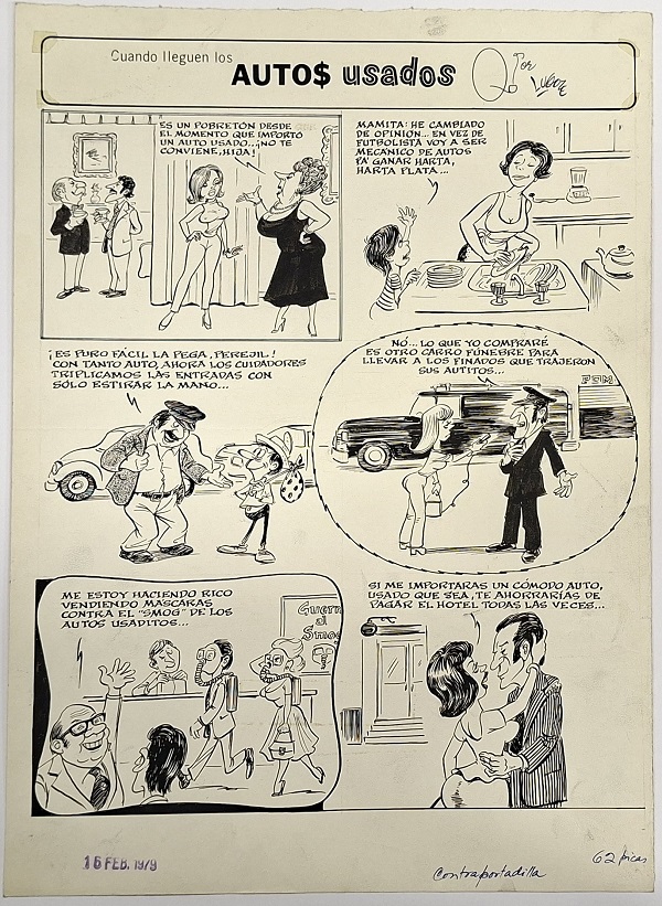 Obra visual de formato rectangular y disposición vertical. Dibujo monocromo. Está compuesta por seis viñetas protagonizadas por varias figuras femeninas y masculinas. En la parte superior, a modo de título, dice: "Cuando lleguen los auto$ usados".