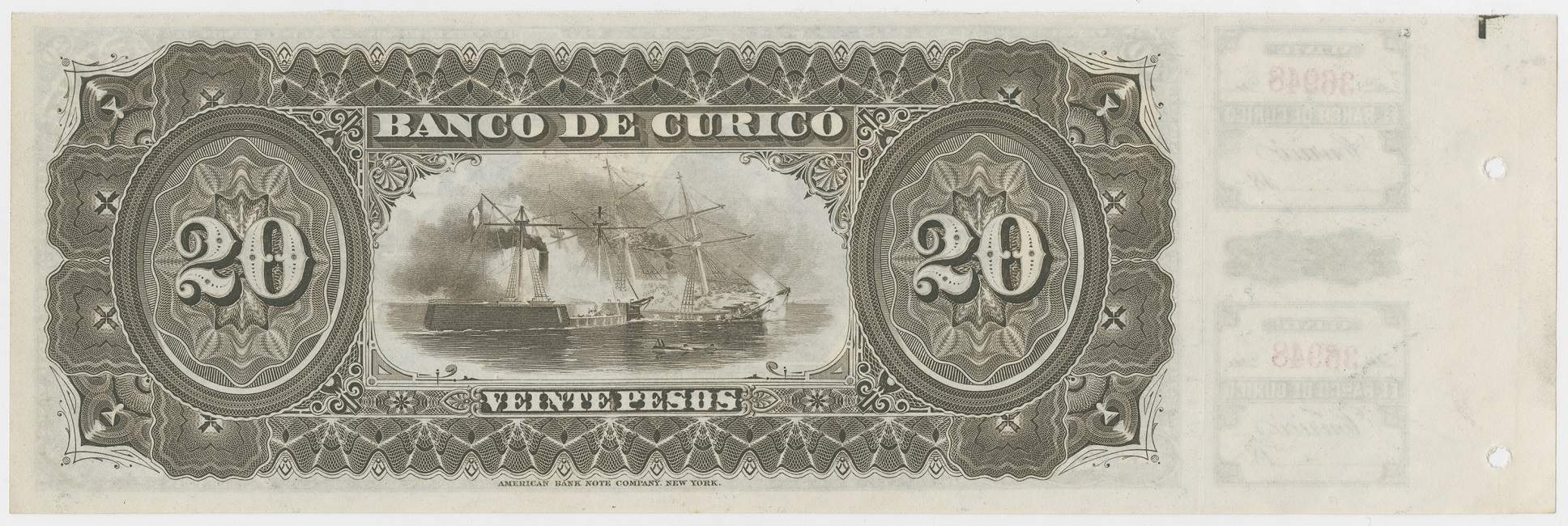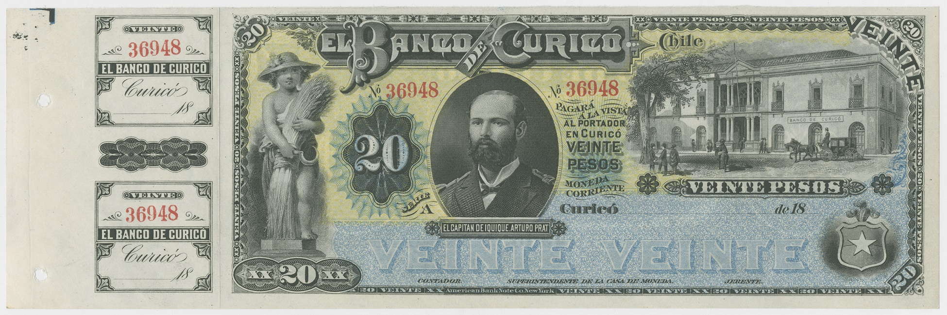 Objeto para realizar transacciones económicas, compuesto por papel impreso con tinta de color verde y azul en el anverso y, en el reverso, solo de color café.