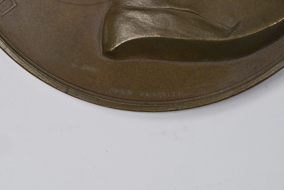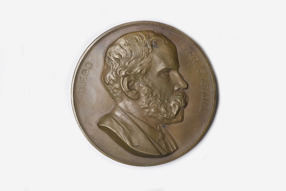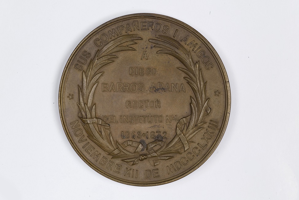 Objeto metálico de formato circular. En el anverso aparece el busto de Diego Barros Arana rodeado por leyenda. En el reverso, una corona de palma atada con una larga cinta, al interior una leyenda.
