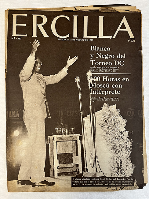 Publicación periódica. Papel impreso en disposición horizontal. En tapa texto impreso en tinta negra y blanca en parte superior, cubre el plano fotografía impresa en blanco y negro (Diputado camerunes Henri Heffa en reunión mundial de los partidos D.C.). En su interior, textos impresos en tinta blanca y negra con diferentes informaciones (noticias, reportajes, crónicas, anuncios publicitarios, etc.). Incluye múltiples fotografias, ilustraciones y tiras cómicas impresa en blanco y negro.