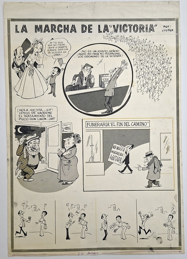 Obra visual de formato rectangular y disposición vertical. Dibujo monocromo. Está compuesta por ocho viñetas protagonizadas por figuras masculinas y femeninas. En la parte superior, a modo de título, dice: "LA MARCHA DE LA VICTORIA". Sobre algunas formas se observa un papel adhesivo con distintos diseños o tramas.