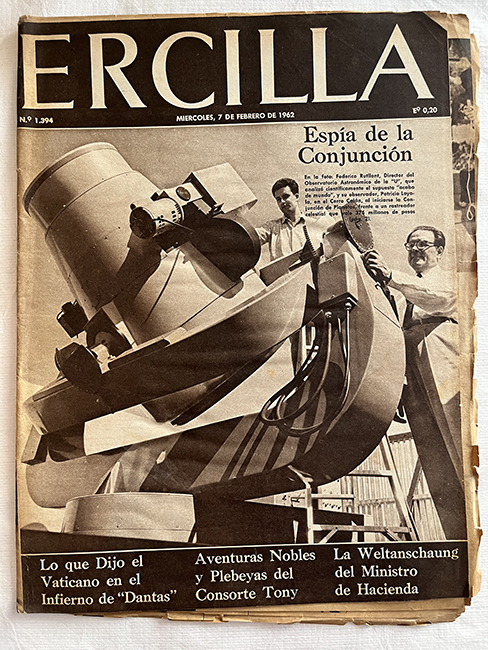 Publicación periódica. Papel impreso en disposición horizontal. En tapa texto impreso en tinta negra y blanca en parte superior, cubre el plano fotografía impresa en blanco y negro (Astronomos en observatorio en el Cerro Calán). En su interior, textos impresos en tinta blanca y negra con diferentes informaciones (noticias, reportajes, crónicas, anuncios publicitarios, etc.). Incluye múltiples fotografias, ilustraciones y tiras cómicas impresa en blanco y negro.