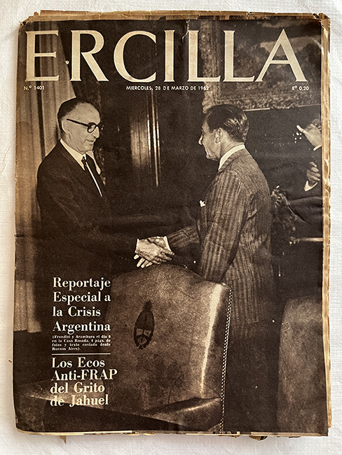 Publicación periódica. Papel impreso en disposición horizontal. En tapa texto impreso en tinta negra y blanca en parte superior, cubre el plano fotografía impresa en blanco y negro (Presidentes argentinos, en mando Frondizi y electoral Aramburu). En su interior, textos impresos en tinta blanca y negra con diferentes informaciones (noticias, reportajes, crónicas, anuncios publicitarios, etc.). Incluye múltiples fotografias, ilustraciones y tiras cómicas impresa en blanco y negro.