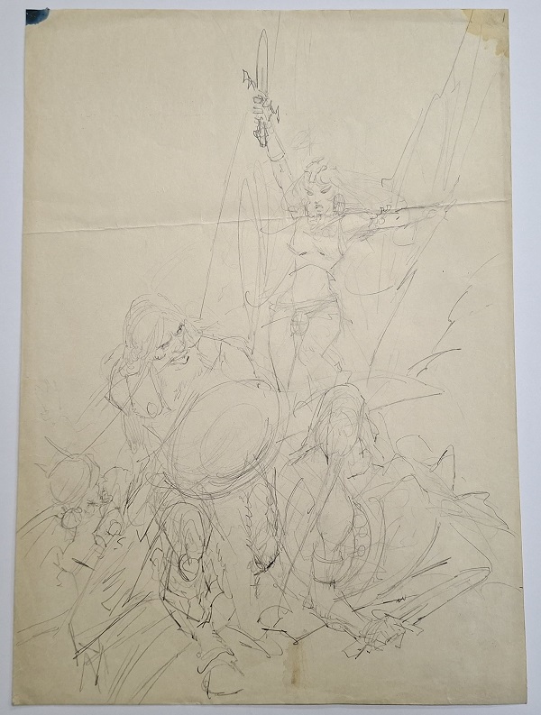 Obra visual de formato rectangular y disposición vertical. Boceto monocromo. En el centro de la composición se destaca una figura masculina portando un escudo y una figura femenina de medio cuerpo con las manos levantadas portando una espada.
