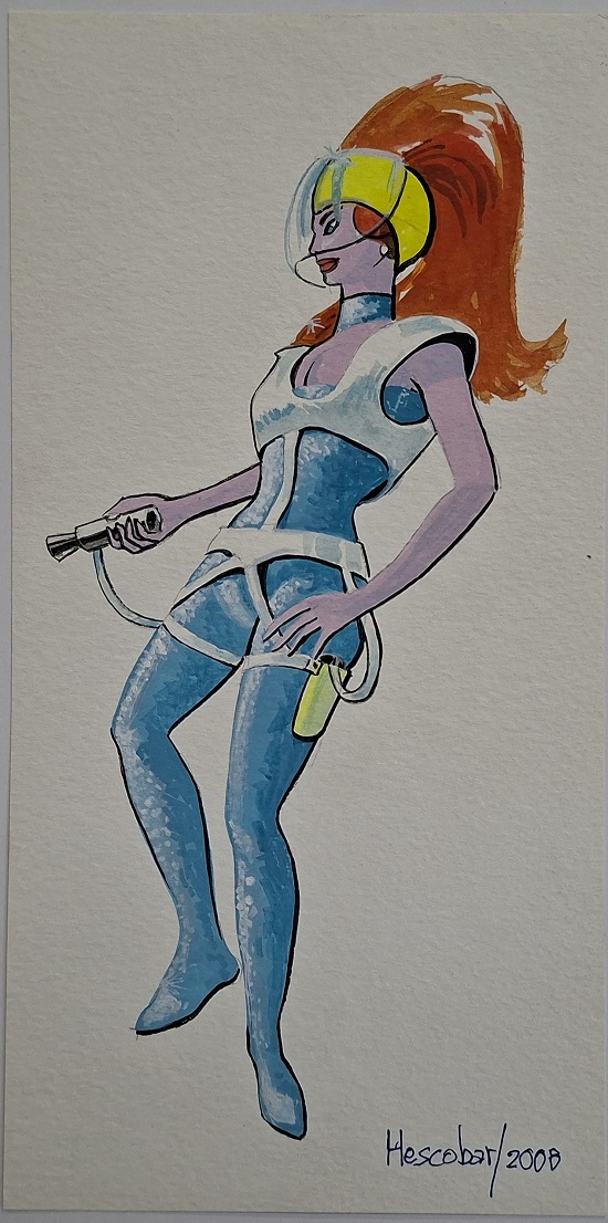 Obra visual de formato rectangular y disposición vertical. Dibujo policromado. En el centro de la composición se destaca una figura femenina de cuerpo completo con vestimenta futurista. En la base tiene la inscripción “HESCOBAR/2008”.