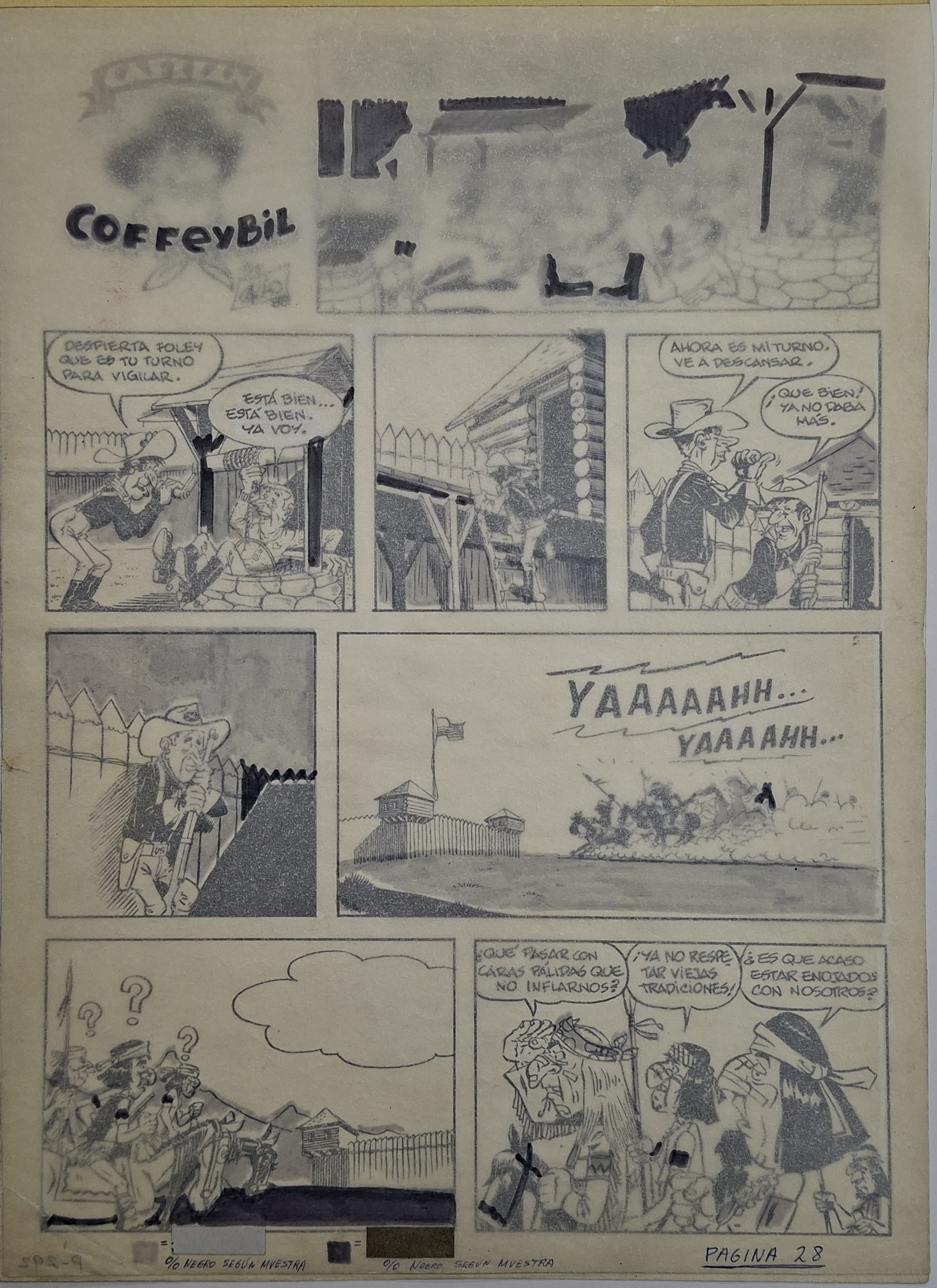 Obra visual de formato rectangular y disposición vertical. Dibujo monocromo. Compuesto por nueve viñetas protagonizadas por figuras masculinas con sombreros y armas de fuego. Tiene un papel semi traslúcido adherido en la parte superior, que recibe el nombre de camisa de color.
