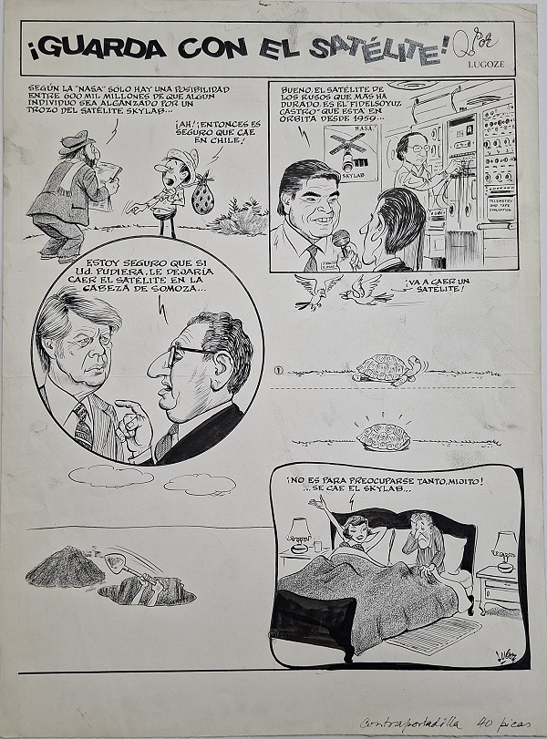 Obra visual de formato rectangular y disposición vertical. Dibujo monocromo. Está compuesto por seis viñetas protagonizadas por figuras masculinas y una femenina. En la parte superior, a modo de título, dice: "¡GUARDA CON EL SATÉLITE!".