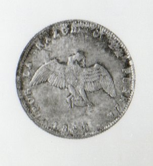 Objeto metálico de formato circular. En el anverso aparece la inscripción MEDIO / DÉCIMO, circundada por dos ramas de laurel atadas con una cinta y leyenda circundante. Por el reverso, un cóndor con alas expendidas, con eslabones de cadena en el pico y garras. Le rodea una leyenda.