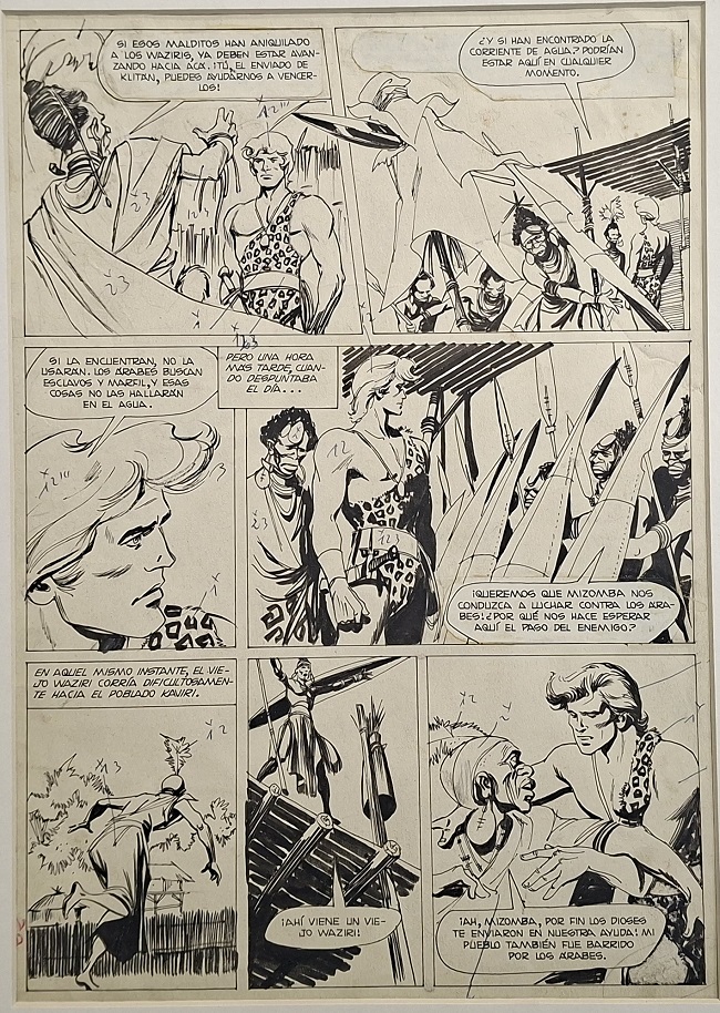 Obra visual en formato rectangular y disposición vertical. Dibujo monocromo. Está compuesto por siete viñetas protagonizadas por varias figuras masculinas. Tiene diferentes números para indicar o sugerir colores.