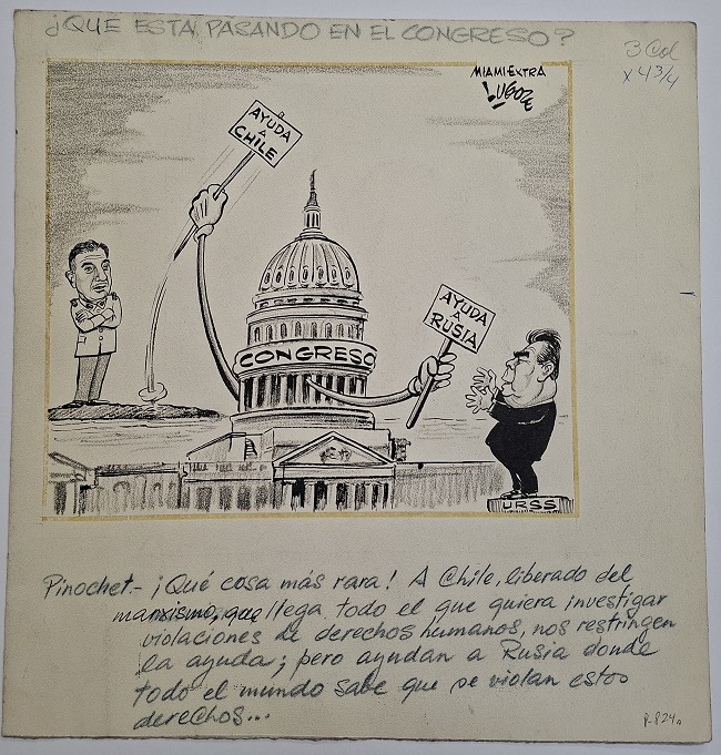 Obra visual de formato rectangular y en disposición horizontal. En el centro de la composición una estructura semicircular con un letrero que dice CONGRESO, desde los costados salen dos manos con letreros, uno dice “Ayuda a Chile” y el otro “Ayuda a Rusia”. Bajo estos, dos figuras masculinas de cuerpo completo. Fuera del cuadro, un texto manuscrito.