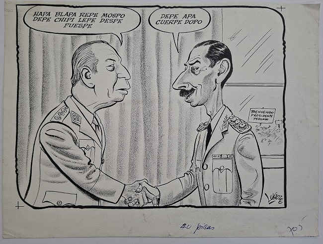 Obra visual de formato rectangular y en disposición horizontal. En el centro de la composición dos figuras masculinas de medio cuerpo estrechando sus manos, ambos visten trajes militares.