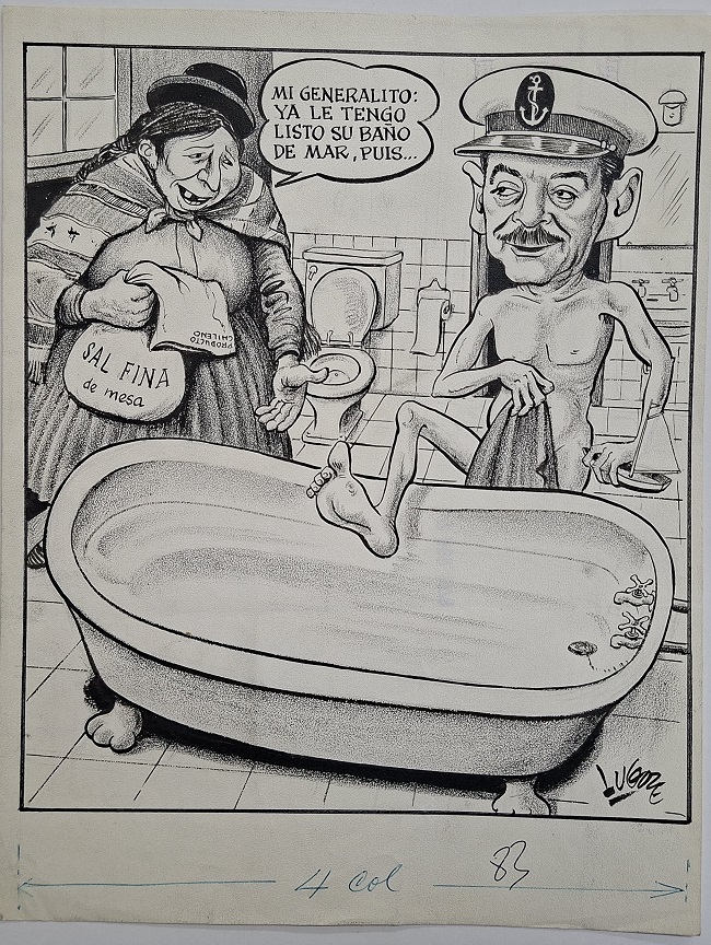 Obra visual de formato rectangular y en disposición vertical. En la composición se destaca, en primer plano, una figura masculina semi desnudo ingresando a un contenedor ovalado con líquido. En segundo plano, una figura femenina sosteniendo una bolsa que dice: "SAL FINA".