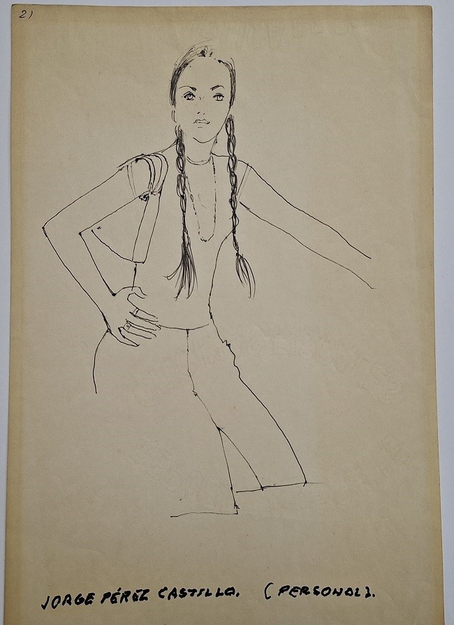 Obra visual en formato rectangular y disposición vertical. Dibujo monocromo. En el centro de la composición se ubica una figura femenina posando con una mano en la cintura, tiene dos trenzas largas y una bolsa en su hombro derecho.