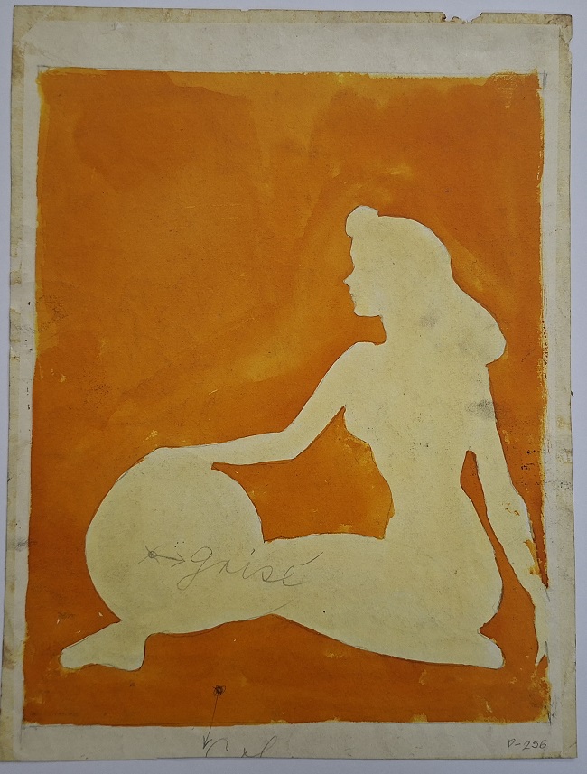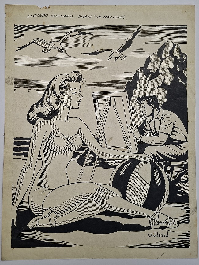 Obra visual en formato rectangular y disposición vertical. Dibujo monocromo. En primer plano, una figura femenina posando sentada en una superficie, tiene apoyada su mano izquierda sobre una esfera. De fondo, una figura masculina pintando la escena con apoyo de un atril.
