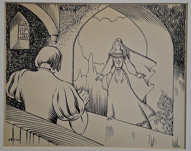 Obra visual de formato rectangular y disposición horizontal. Dibujo monocromo. En el centro de la composición se destaca una figura femenina de cuerpo completo bajo un arco ojival. En el primer plano, pero de espalda, una figura masculina observando.
