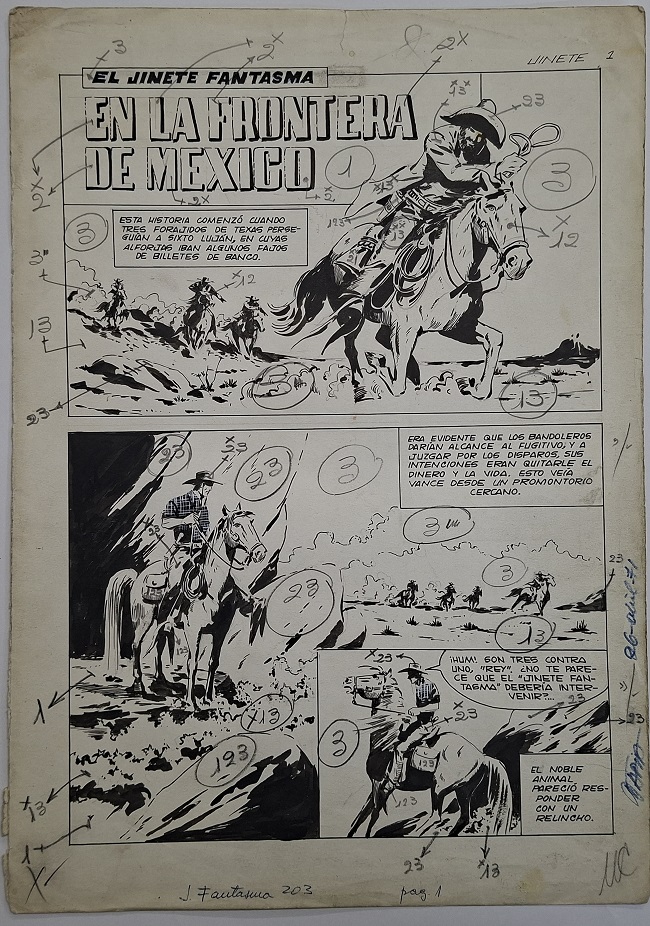 Obra visual de formato rectangular y disposición vertical. Dibujo monocromo. Está compuesto por tres viñetas protagonizadas por varias figuras masculinas montando a caballo. En la parte superior, a modo de título, dice: "EL JINETE FANTASMA/EN LA FRONTERA DE MEXICO". Tiene diferentes números al interior de círculos irregulares para indicar o sugerir colores.