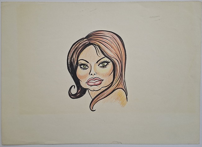 Obra visual en formato rectangular y disposición horizontal. Dibujo policromado. En la composición se destaca un rostro femenino con expresión exagerada.