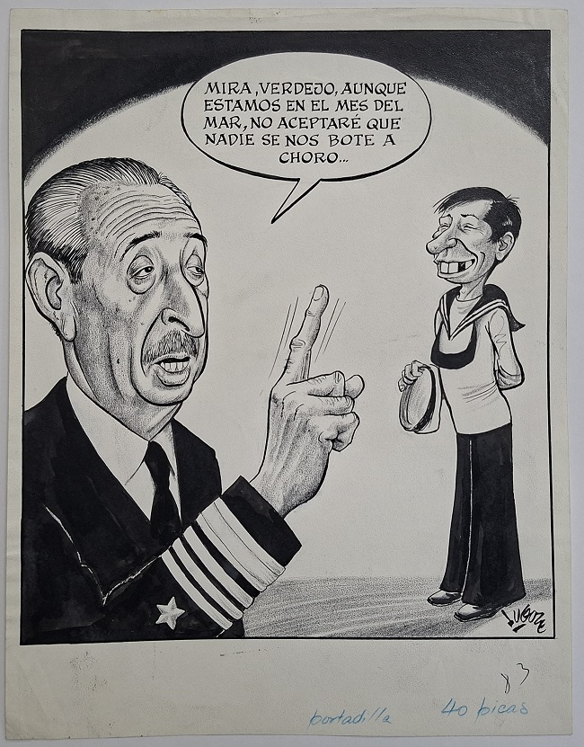 Obra visual en formato rectangular y disposición vertical. Dibujo monocromo. En la composición se destaca, en primer plano, una figura masculina de medio cuerpo vestido con uniforme. En segundo plano una figura masculina de cuerpo completo con uniforme de marinero.