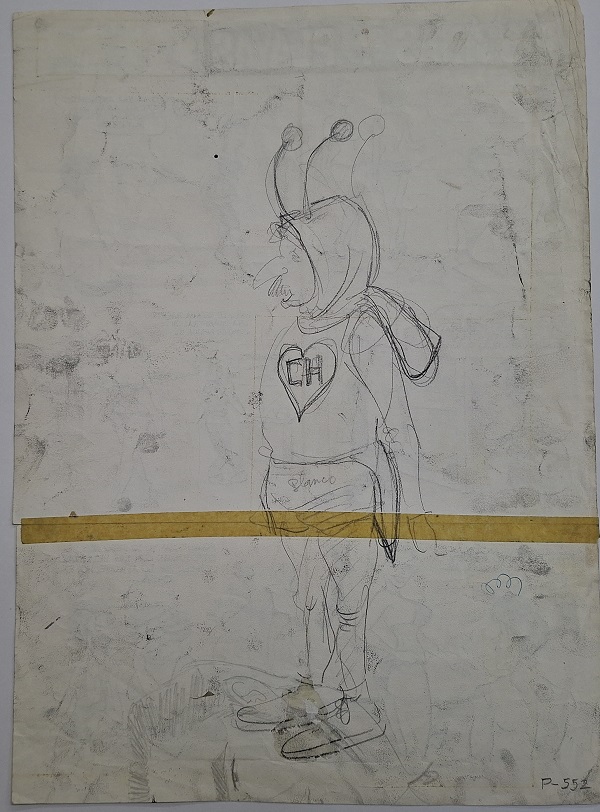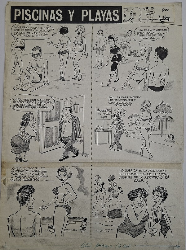 Obra visual en formato rectangular y disposición vertical. Dibujo monocromo. Está compuesta de seis viñetas, protagonizadas por figuras masculinas y femeninas. En la parte superior, a modo de título, dice: "PISCINAS Y PLAYAS". En el reverso tiene un boceto de un personaje de perfil y cuerpo completo.