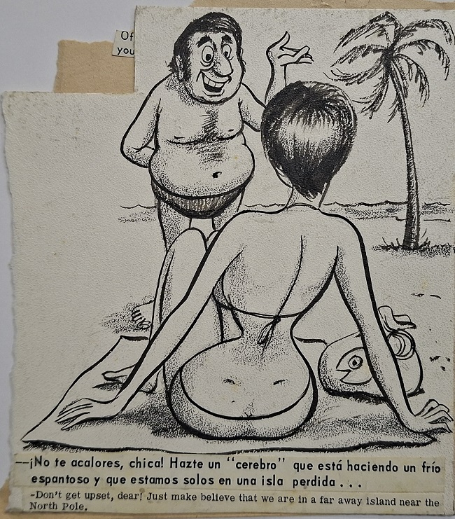 Obra visual en formato rectangular y disposición vertical. Dibujo monocromo. En primer plano, y en el centro de la composición, una figura femenina de espalda. En segundo plano, y de frente, una figura masculina observando. De fondo, paisaje playero. La esquina superior izquierda está recortada en forma de rectángulo.