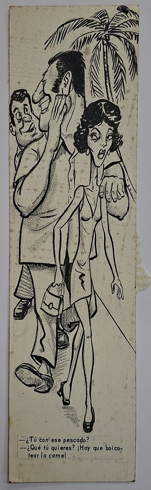 Obra visual en formato rectangular y disposición vertical. Dibujo monocromo. En el centro de la composición se destaca dos figuras masculinas y una femenina. Están caminando en medio de un paisaje playero.