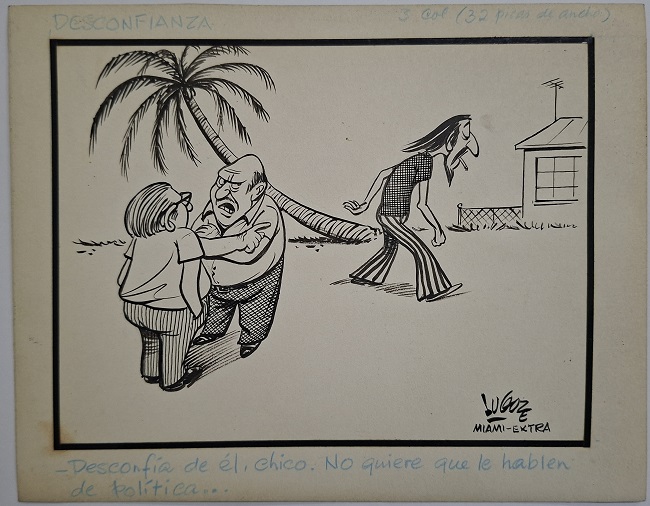 Obra visual en formato rectangular y disposición horizontal. Dibujo monocromo. En el primer plano de la composición dos figuras masculinas de cuerpo completo conversando, en segundo plano una figura masculina caminando. De fondo paisaje playero.