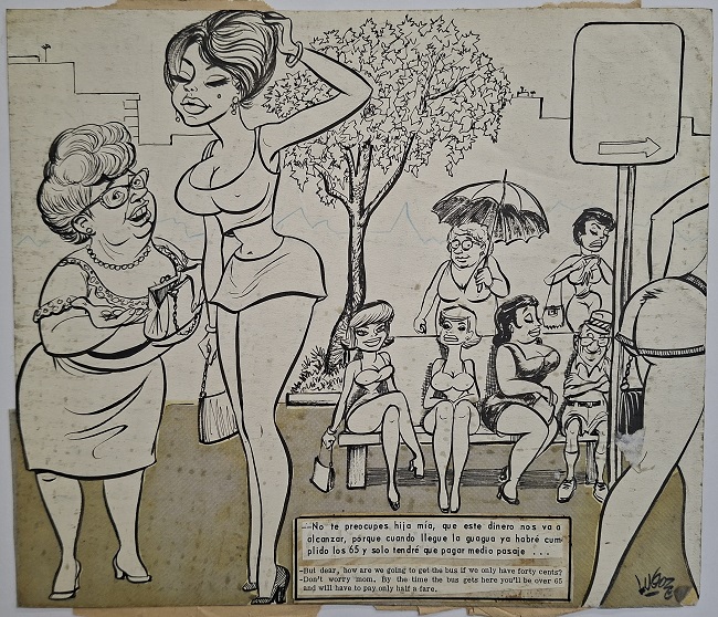Obra visual en formato rectangular y disposición horizontal. Dibujo monocromo. En el primer plano de la composición dos figuras femeninas conversando, de fondo, y sobre una banca, otras figuras femeninas y una masculina. Sobre la forma que representa el suelo se observa un papel adhesivo con una trama romboidal.