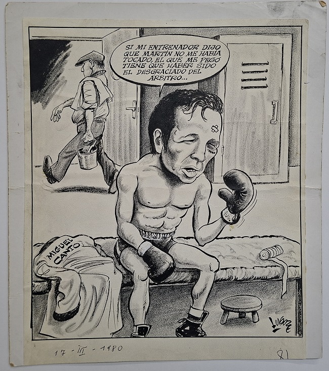 Obra visual en formato rectangular y disposición vertical. Dibujo monocromo. En el centro de la composición una figura masculina semidesnuda con guantes de boxeo, está sentado sobre un mobiliario. Al costado una vestimenta con el nombre “Miguel Canto”.