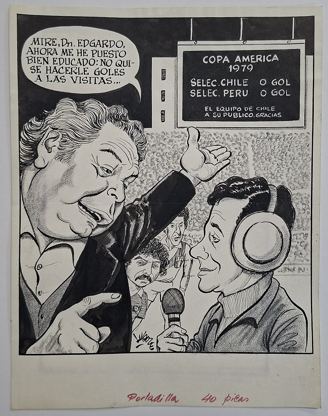 Obra visual en formato rectangular y disposición vertical. Dibujo monocromo. En primer plano dos figuras masculinas, de medio cuerpo, conversando. En segundo plano dos figuras masculinas observando. De fondo la gradería de un recinto deportivo.